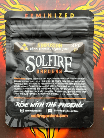 Sinfusion es una combinación exclusiva de Solfire Gardens que fusiona la energía equilibrada del híbrido Miami Madness con el perfil cremoso y exótico de Sin n Juice. Esta genética presume de estabilidad, aroma complejo y potencia ideal para cultivadores exigentes.